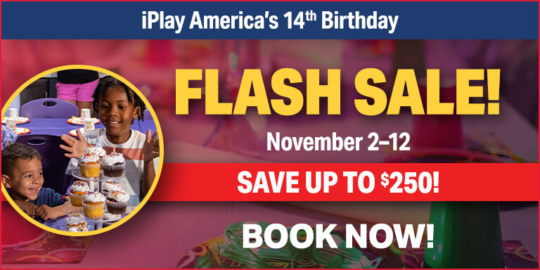 iPlay America is turning 14 years old! To celebrate, we’re hosting a birthday party FLASH SALE where you can get GREAT DEALS on our most popular parties. Save up to $250 on awesome party packages. See the discounts below! Call ASAP 732-577-8200 to start booking today!