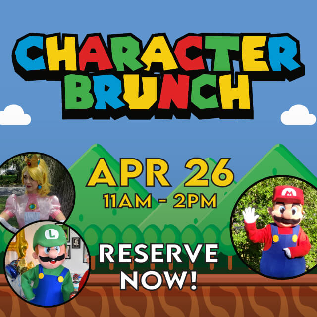 Brunch with the Super Bros and Peach Princess at The Bistro! April 26th from 11a-2pm, enjoy photo-ops, a specialty kids menu and a themed coloring book!