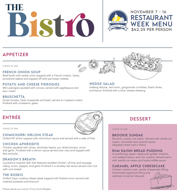 Stop by to experience our special menu during Jersey Shore Restaurant Week 2025! The $42.25/person event menu features some of our most popular dishes at an affordable price point. It includes 1 appetizer, 1 entree, and 1 dessert! This is a great chance to try a variety of delicious food at price you can’t beat.