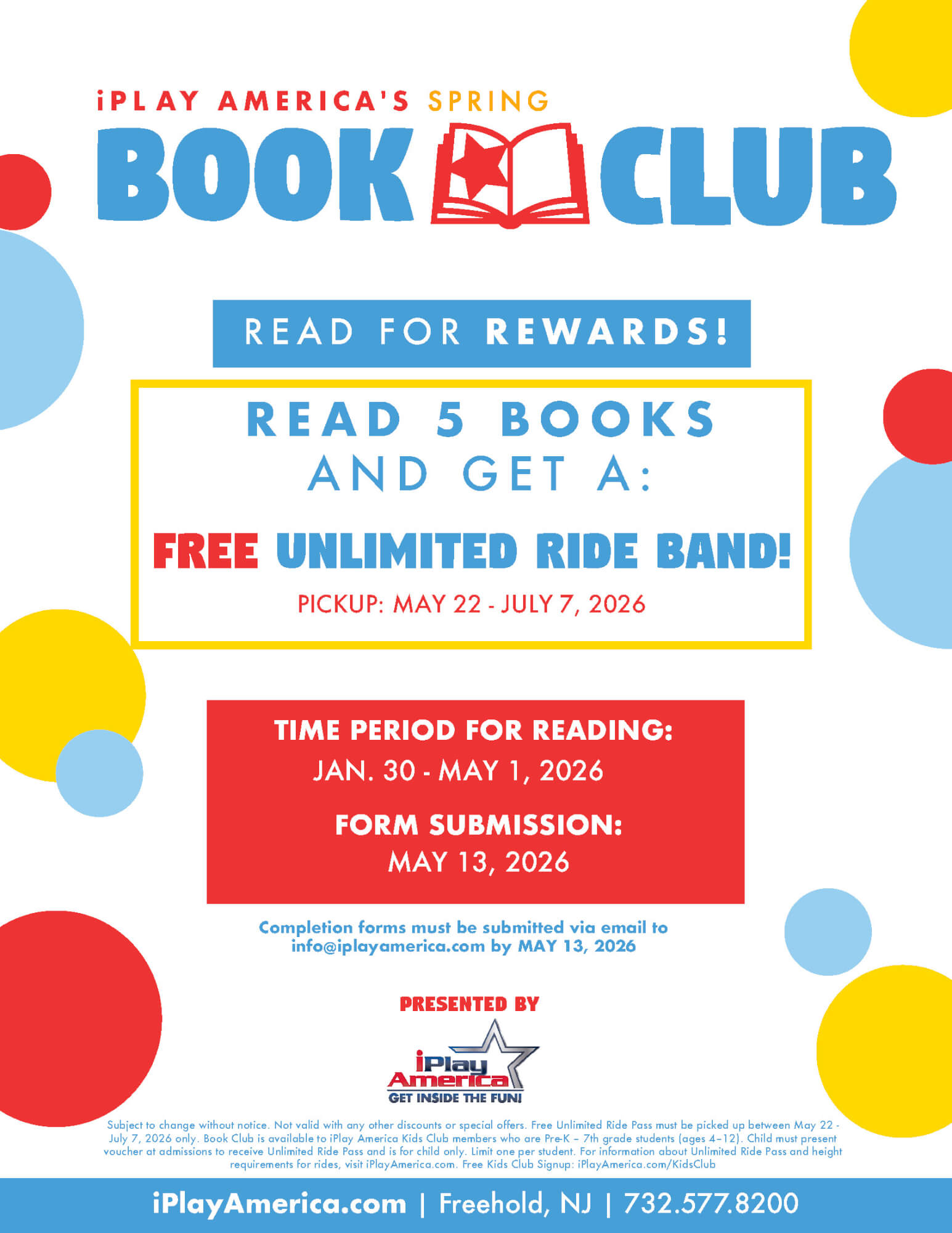 Subject to change without notice. Not valid with any other discounts or special offers. Free Unlimited Ride Pass must be picked up between May 22 – July 7, 2026 only. Book Club is available to iPlay America Kids Club members who are Pre-K – 7th grade students (ages 4–12). Child must present voucher at admissions to receive Unlimited Ride Pass and is for child only. Limit one per student. For information about Unlimited Ride Pass and height requirements for rides, visit iPlayAmerica.com. Free Kids Club Signup: iPlayAmerica.com/KidsClub